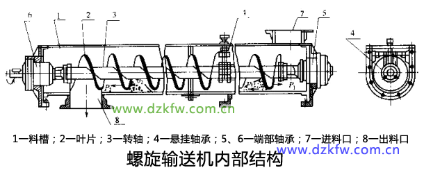 料槽由头节、中间节和尾节组成,各节之间用螺栓连接。每节料槽的标准长度为1~3m。常用3~6mm的钢板制成。料槽上部用可拆盖板封闭,进料口设在盖板上,出料口则设在料槽的底部,有时沿长度方向开数个卸料口,以便在中间卸料。在进出料口处均配有闸门。料槽的上盖还设有观察孔,以观察物料的输送情况。料槽安装在用铸铁制成或用钢板焊接成的支架上,然后紧固在地面上。螺旋与料槽之间的间隙为5~15mm。间隙太大会降低输送效率,太小则增加运行阻力,甚至会使螺旋叶片及轴等机件扭坏或折断。轴承