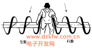 螺旋由转轴和装在上边的叶片组成。转轴有实心和空心管两种。在强度相同的情况下,管轴较实心轴质量轻,连接方便,所以比较常用。管轴用特厚无缝钢管制成,轴径一般在50~100mm之间,每根轴的长度一般在3m以下,以便逐段安装。螺旋叶片有左旋和右旋之分,确定旋向的方法如图4所示。物料被推送方向由叶片的方向和螺旋的转向所决定。图3为右旋螺旋,当螺旋按n方向旋转时,物料沿v1的方向推送到卸料口处;当螺旋按反向旋转时,物料沿v2的方向被推送。若采用左旋螺旋,物料被推送的方向则相反。图3 螺旋输送机内部结构