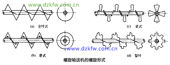 根据被输送物料的性质不同,螺旋有各种形状,如图5所示。在输送干燥的小颗粒物料时,可采用全叶式[图5(a)];当输送块状或黏湿性物料时,可采用桨式[图5(c)]或型叶式[图5(d)]螺旋。采用桨式或型叶式螺旋除了输送物料外,还兼有搅拌、混合及松散物料等作用。叶片一般采用3~8mm厚的钢板冲压而成,焊接在转轴上。对于输送磨蚀性大的物料和黏性大的物料,叶片用扁钢轧成或用铸铁铸成。图5 螺旋形式