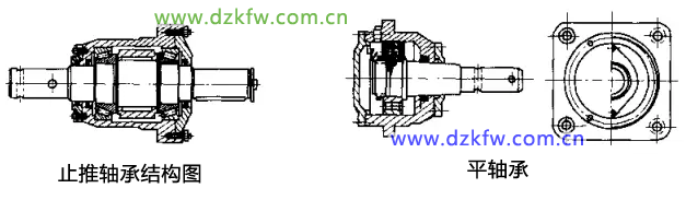 螺旋是通过头、尾端的轴承和中间轴承安装在料槽上的。螺旋轴的头、尾端分别由止推轴承和径向轴承支承。止推轴承一般采用圆锥滚子轴承,如图6所示,止推轴承可承受螺旋轴输送物料时的轴向力。设于头节端可使螺旋轴仅受拉力,这种受力状态比较有利,止推轴承安装在头节料槽的端板上,它又是螺旋轴的支承架。尾节装置与头节装置的主要区别在于尾节料槽的端板上安装的是双列向心球面轴承或滑动轴承。如图7所示。图6 止推轴承结构图 图7 平轴承