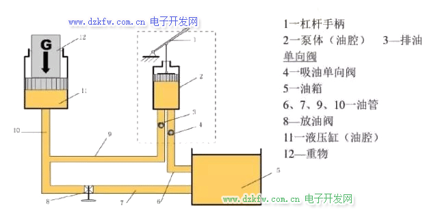 从千斤顶的液压系统组成和工作原理可以看出,液压系统一般有以下几个部分组成: