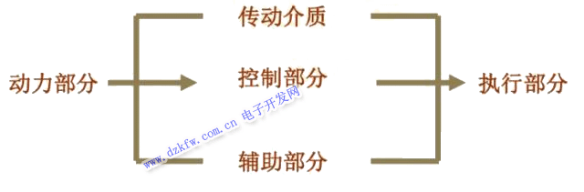 从图中可以看出,液压传动是以液体作为工作介质来进行工作的,一个完整的液压传动系统由以下几部分组成:动力部分、控制部分、辅助部分和执行部分。