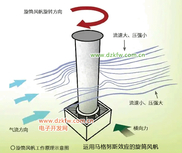 马格努斯效应风轮,由自旋的圆柱体组成,当它在气流中工作时,产生的移动力是由于马格努斯效应引起的,其大小与风速成正比。有的垂直轴风轮使用管道或者漩涡发生器塔,通过套管或者扩压器使水平气流变成垂直气流,以增加速度,有些还利用太阳能或者燃烧某种燃料,是水平气流变成垂直方向的气流。