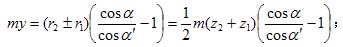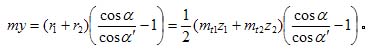my=a′-a=Δa,对于外啮合齿轮副,a′>a时my为正,这时两分度曲面分离(图6-22b);a′<a时my为负,这时两分度曲面相交(图6-22c)。内齿轮副则相反。于是可得:![]()