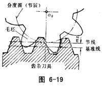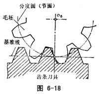 用齿条刀具或齿轮插刀加工齿轮时,若齿轮毛坯的分度圆与齿条刀具的基准线(图6-18);或与插刀的分度圆分别相切,这时毛坯和刀具的相对安装位置称刀具的标准安装。刀具标准安装加工出来的齿轮是标准齿轮。