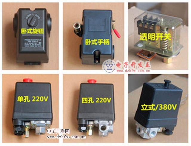 空压机开关的分类 主要分立式和卧式。(另分单孔和四孔,单相和三相等等)