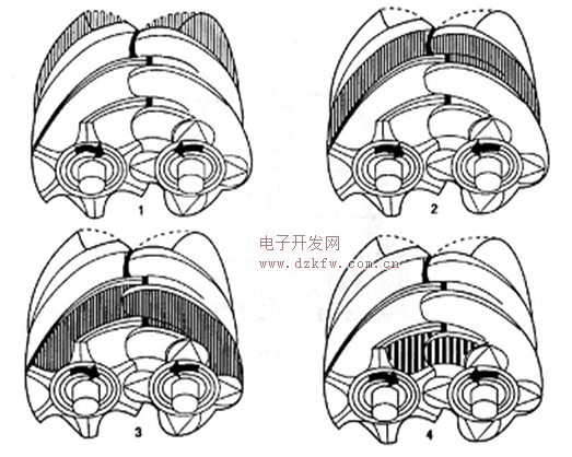 如下图所示,螺杆压缩机的工作循环可分为吸气(1)、压缩(2)(3)和排气(4)三个过程。随着转子旋转,每对相互啮合的齿相继完成相同的工作循环。被密封在齿间容积中的气体随齿移动所占据的体积也随之减小,导致压力升高,从而实现气体的压缩过程,当齿间容积与排气孔口连通后,即开始排气过程。
