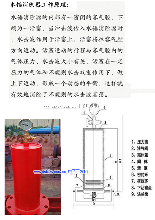 该设备主要防止停泵水锤,一般安装在水泵出口管道附近,利用管道本身的压力为动力来实现低压自动动作,即当管道中的压力低于设定保护值时,排水口会自动打开放水泄压,以平衡局部管道的压力,防止水锤对设备和管道的冲击,消除器一般可分为机械式和液压式两种,机械式消除器动作后由人工恢复,液压式消除器可自动复位。