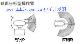 特点:中心支架附近的工作范围大,两个转动驱动装置容易密封,覆盖工作空间较大。但该坐标复杂,难以控制,且直线驱动装置存在密封的问题。