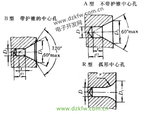 在加工长轴时,轴端需打中心孔。中心孔有四种形式,可根据需要选用。屏幕中画出了其中两种中心孔。中心孔是标准结构,在图纸上不必画出,只在轴端标注代号和数量,并用符号表明完工后是否保留。具体形式和尺寸大小可查国家标准GB145-85。