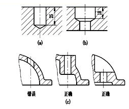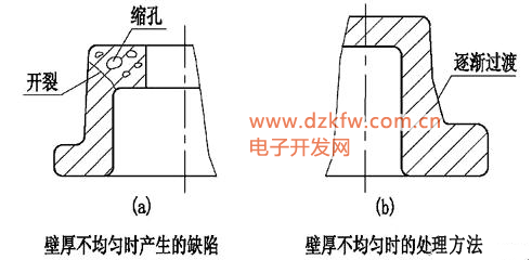 为了避免浇铸时零件各部分因冷却速度不同而产生缩孔或裂纹等缺陷(图a),铸件壁厚应均匀。不要突然变化,厚薄不同的部件应逐渐过渡(图b)。