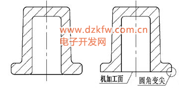 毛坯经过机械加工后,粗皮被削去,铸造圆角消失并产生了加工形成的尖角。