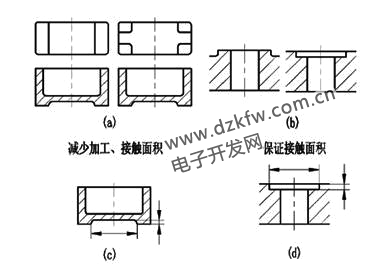 零件上与其他零件接触的表面,一般都要进行加工。对于接触面积大的部位,应尽量减少接触面积,以便节约加工费用、增加接触的稳定性(图a)。而对于接触面分散或所在平面不能加工的,则应保证接触部位的加工面积(图b)。为此,在铸件毛坯上经常铸出各种凸台和凹坑,如安装底面、螺栓支承面等。