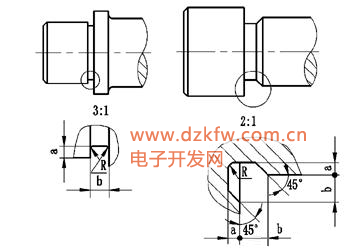 砂轮越程槽的结构形式和尺寸已经标准化,可由国家标准GB6403.5-86查得。标注尺寸时,按查得的数值注出。为了便于注写尺寸,越程槽一般用局部放大图画出。