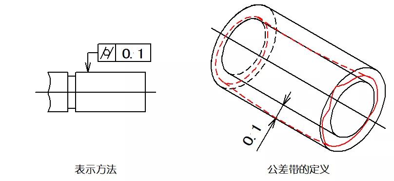 ▲图样示例:公差带是半径差为公差值0.1mm的两个同轴圆柱面之间的区域。