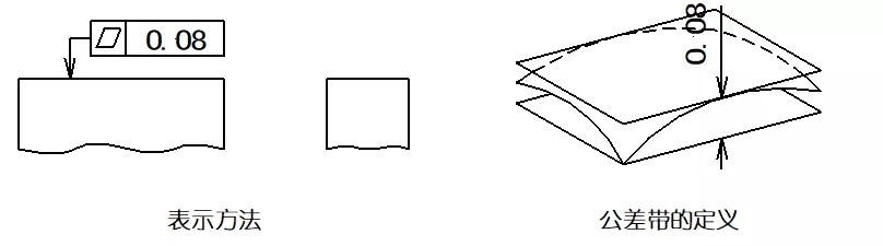 ▲图样示例:公差带是位于距离0.08mm的两个平行平面之间的区域。