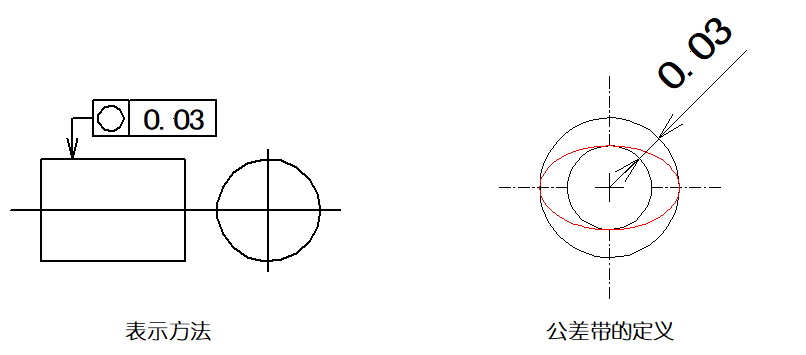 ▲图样示例:公差带必须在同一正截面上,半径差为公差值0.03mm的两个同心圆之间的区域。