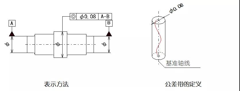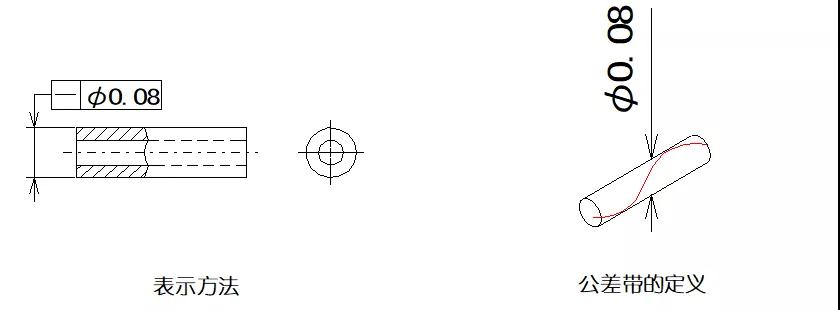 ▲同轴度公差图例:公差值加注记号时,公差带是直径0.08mm的圆柱之间区域。圆形公差带的轴线与基准一致。