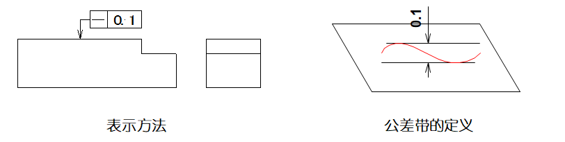 ▲图样示例1:在给定平面内,公差带必须在距离为0.1mm的两平行直线间的区域。