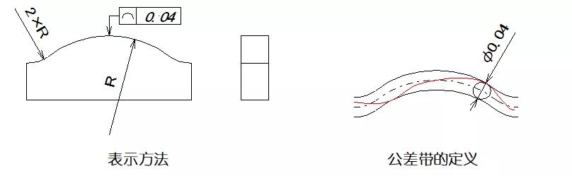 ▲图样示例:公差带是由包络一系列直径为公差0.04mm的圆的两包络线之间的区域。诸圆的圆心位于具有理论正确几何形状的线上。