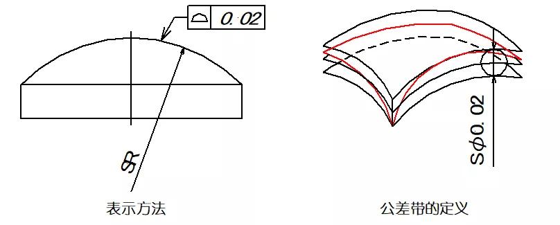 ▲图样示例:公差带是由包络一系列直径为0.02mm的球的两条包络线之间,诸球的中心理论上应位于理论正确几何形状的面上。