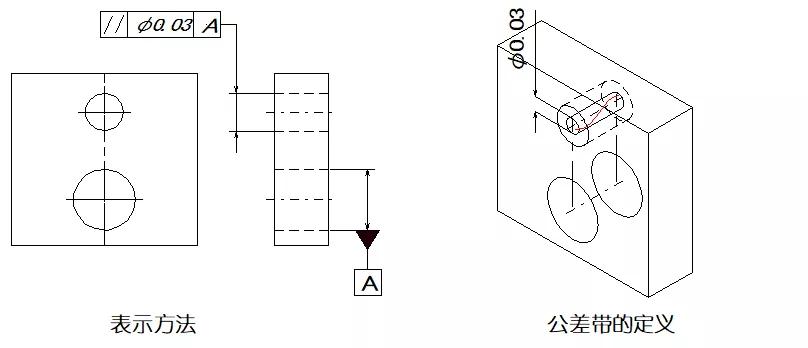 ▲图样示例:如公差值前加注记号φ、则公差带为基准平行直径φ0.03mm的圆柱面内。