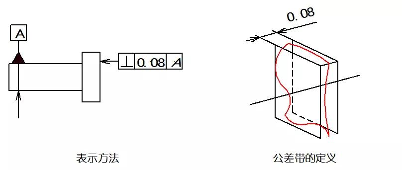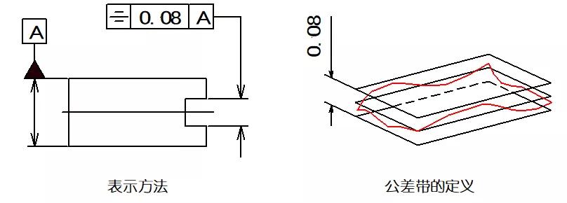▲图例说明:公差带必须位于距离为0.08mm且垂直于基准线的两平行平面之间。