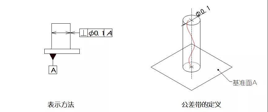 ▲图例说明:公差带前加注记号φ,则公差带垂直于基准面直径为0.1mm的圆柱面内。