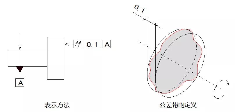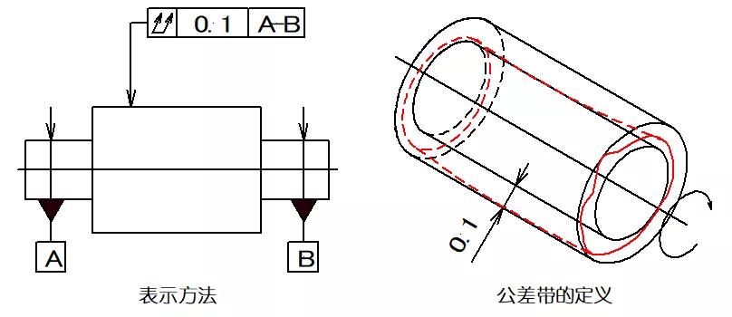 ▲图例说明1:公差带是距离为半径差0.1mm,且与基准同轴的两圆柱面之间的区域。
