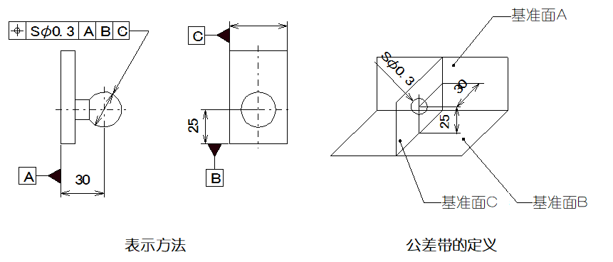 ▲图例说明:公差带前加注记号Sφ时、公差带是直径0.3mm的球内区域。球公差带的中心点的位置是相对于基准A,B及C的理论正确尺寸。