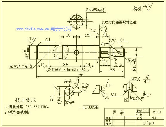 如图中所示的表面粗糙度为Ra6.3的右轴肩,被选为长度方向的主要尺寸基准,由此注出13、28、1.5和26.5等尺寸;再以右轴端为长度方向的辅助基,从而标注出轴的总长96。
