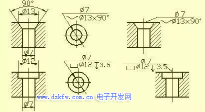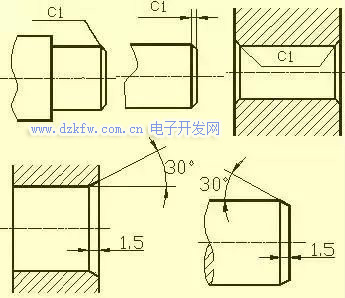 在标注尺寸方面,通常选用设计上要求的轴线、重要的安装面、接触面(或加工面)、箱体某些主要结构的对称面(宽度、长度)等作为尺寸基准。对于箱体上需要切削加工的部分,应尽可能按便于加工和检验的要求来标注尺寸。 5.零件常见结构的尺寸注法常见孔的尺寸注法(盲孔、螺纹孔、沉孔、锪平孔);倒角的尺寸注法。