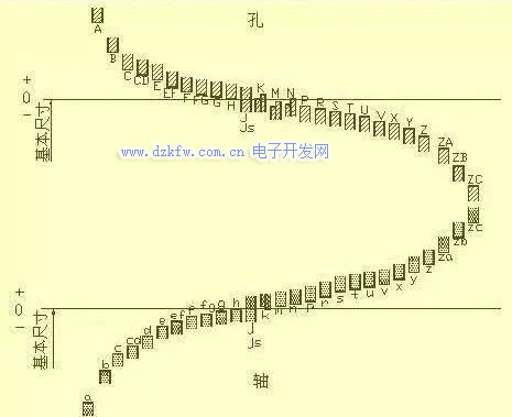 (2)基本偏差基本偏差是指在标准的极限与配合中,确定公差带相对零线位置的上偏差或下偏差,一般指靠近零线的那个偏差。当公差带在零线的上方时,基本偏差为下偏差;反之,则为上偏差。基本偏差共有28个,代号用拉丁字母表示,大写为孔,小写为轴。从基本偏差系列图中可以看出:孔的基本偏差A~H和轴的基本偏差k~zc为下偏差;,孔的基本偏差K~ZC和轴的基本偏差a~h为上偏差,JS和js的公差带对称分布于零线两边、孔和轴的上、下偏差分别都是+IT/2、-IT/2。基本偏差系列图只表示公差带的位置,不表示公差的大小,因此,公差带一端是开口,开口的另一端由标准公差限定。
