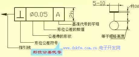 1) 形状和位置公差的代号国家标准GB/T 1182-1996规定用代号来标注形状和位置公差。在实际生产中,当无法用代号标注形位公差时,允许在技术要求中用文字说明。形位公差代号包括:形位公差各项目的符号,形位公差框格及指引线,形位公差数值和其他有关符号,以及基准代号等。框格内字体的高度h与图样中的尺寸数字等高。
