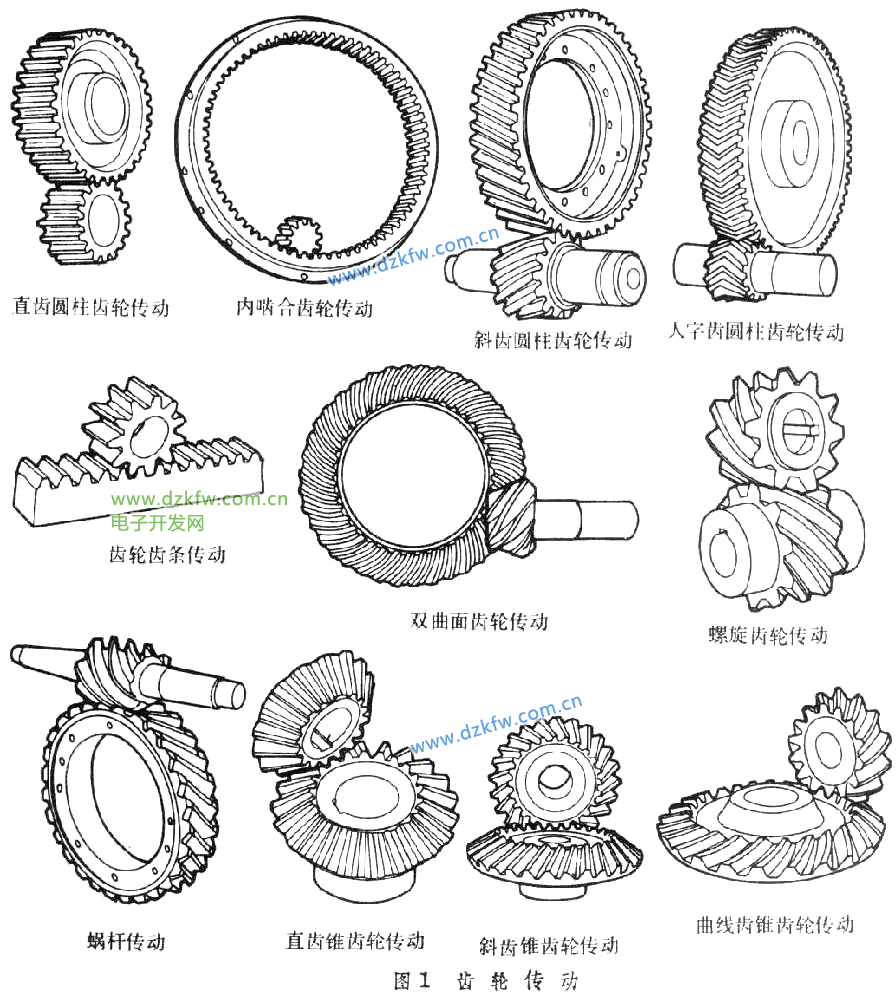 齿轮传动按齿轮的外形可分为圆柱齿轮传动、锥齿轮传动、非圆齿轮传动、齿条传动和蜗杆传动。