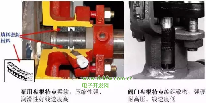 盘根通常由较柔软的线状物编织而成,通过截面积是正方形的条状物填充在密封腔体内,靠压盖产生压紧力,压紧填料,迫使填料压紧在密封表面(轴的外表面和密封腔)上,产生密封效果的径向力,因而起密封作用。
