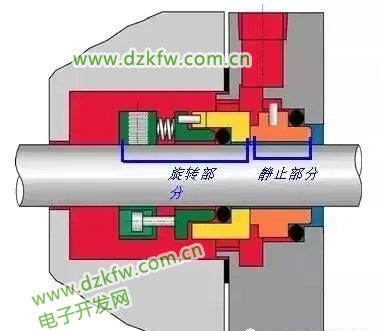 机封总是由旋转部件(黄色部分)和静止部件(橙色部分)两大部分组成,两相对运动的动,静环面成为密封的主密封面。