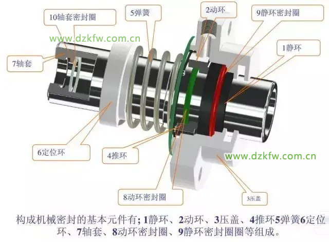 机械密封亦称端面密封,按国家有关标准定义为:由至少一对垂直于旋转轴线的端面在流体压力和补偿机构的弹力(或磁力)作用以及辅助密封的配合下保持贴合并相对滑动,而构成的防止流体泄漏的装置。