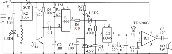 工作过程:IC2、IC3的清0端分别接有R5、C3,R6、C5组成清0电路使两个计数器置0,双稳态中VT3基极接有电容C10。所以通电瞬间VT3基极呈低电位,使VT3截止、集电极呈高电位使VT2导通,因VD8截止使VT4导通,继电器吸合,整机处于通电状态。与此同时,钳位二极管VD3截止使A振荡器开始工作;VD5导通使振荡器B中F6的输入端被钳位在低电平,所以振荡器B停振,振荡器A的脉冲信号,经VD2送到门F1倒相后,经K1送到IC3的EN端负脉冲输入端,每振荡一次计数器计一个数,其输出端按Y0~Y9的顺序分别输出正脉冲,由于VT2集电极为低电位,所以由X1~X10组成的发光管阵列被依次点亮,当计到第十个脉冲时(X10点亮后),IC3的12脚进位端给出一个进位正脉冲,它经门F4倒相变成负脉冲后经C8和C9去触发VT2、VT3组成的双稳态电路使之翻转,即变成VT2截止、VT3导通,VD8导通使VT4截止,继电器关断,整机处于待机状态,与此同时因VD3导通,振荡器A输入端被钳位从而停振。由于VT2截止,其集电极高电位使VD5截止,门F6输入解除钳位,振荡器B开始工作,其输出经VD1、F1送到IC3进行计数,但由于此时VT3导通,VT2截止,所以虽然IC3的Y0~Y9依旧顺序给出正脉冲,但此时X1~X10并不亮,而X11~X20经R10接到VT3集电极(低电位),所以X11~X20依次亮起,到X20亮后,同样IC3的12脚给出进位脉冲经F4倒相后,再次使双稳态翻转,使VT3截止、VT4导通,继电器吸合,电路再次处于通电状态。