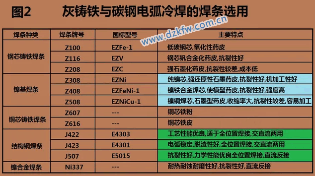 在焊接有白口倾向的铸铁和刚度大的碳素钢时,应先对被焊接头进行退火或回火处理,以便消除残余应力。当用电弧冷焊法对灰铸铁与碳钢进行焊接时,宜选用高聂或镍铁焊条,具体填充材料的焊条选择简图2。