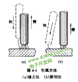 (2)引弧在焊条末端与焊件接触时,焊条提起时间要适当。太快,气体未电离,电弧可能熄灭;太慢,则使焊条和工件粘合在一起,无法引燃电弧。