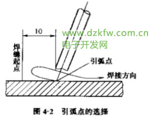在引孤处,由于钢板温度较低,焊条药皮还没有充分发挥作用,会使引弧点处焊缝较高,熔深较小,易产牛气孔,所以在焊缝起始点后10mm处引弧,如图4-2所示。引燃电弧后拉长电弧,并迅速将电弧移至焊縫起点进行预热。