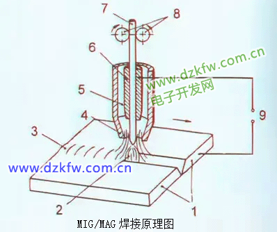 1- 母材 2-电弧 3-焊缝 4-套筒 5-保护气体 6-导电嘴 7-焊丝 8-送丝轮