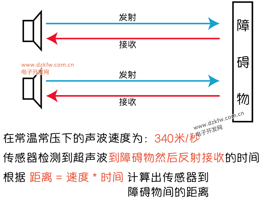 首先传感器发射超声波,并计时,当超声波接触到障碍物会被反射,当传感器接收到反射波,计时结束,然后利用距离、速度、时间公示进行计算,得到传感器到障碍物间的距离。