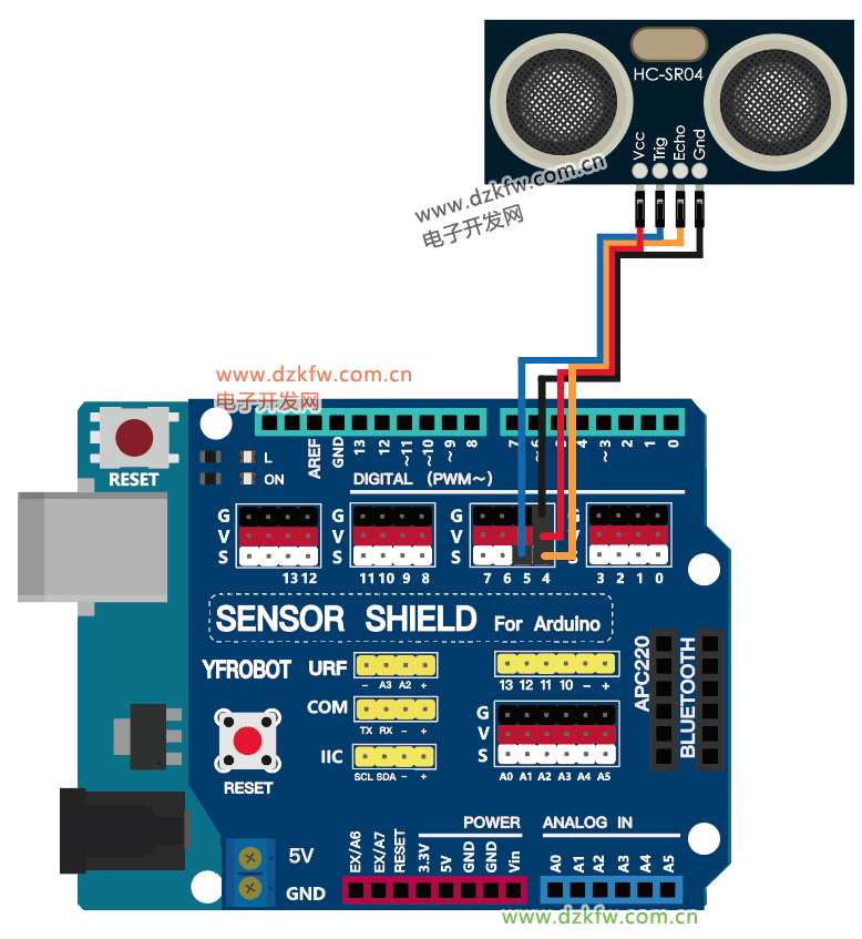 接下来将HCSR04超声波传感器与Arduino进行连接,除了VCC及GND分别接正负极外,这里“Trig”与数字端口D5连接,“Echo”与数字端口D4连接,如下图所示: