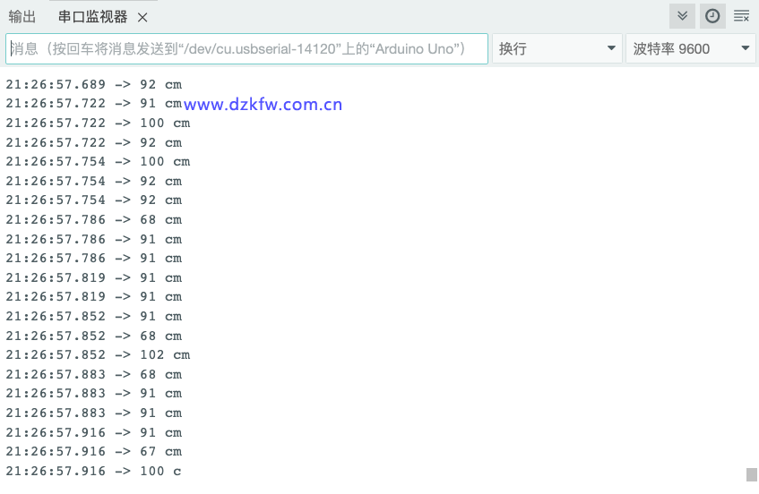 接下来将上述程序上传至Arduino板,并且打开串口监视器,观测所测的数值是否准确。