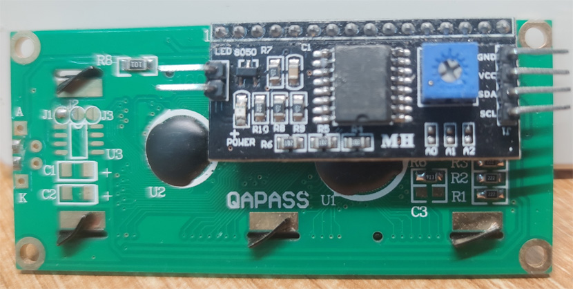 首先观察LCD1602显示屏的正反面(其中反面为实物图),当前LCD显示屏的驱动板(即黑色的电路板)上共6个引脚,左侧两个相邻的引脚直接连接即可,连接后便打开了背光;右侧的引脚“GND接负极”“VCC接正极”已经比较熟悉了,对于“SDA”及“SCL”引脚,我们先对此进行详细介绍。