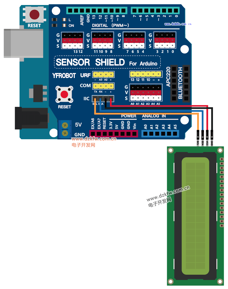 在Arduino拓展板的复位键旁边设有专门的I2C引脚,可直接对应连接,当然也可以“SDA - A4”“SCL - A5”的线序连接。