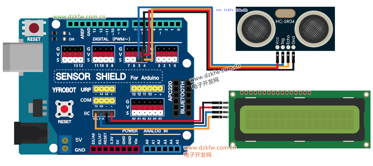 按照上图将“SR04超声波传感器”及“LCD1602显示屏”与Arduino板进行连接;“Trig”与数字端口D5连接,“Echo”与数字端口D4连接,LCD显示屏的引脚连接到IIC区域;然后完成以下程序: