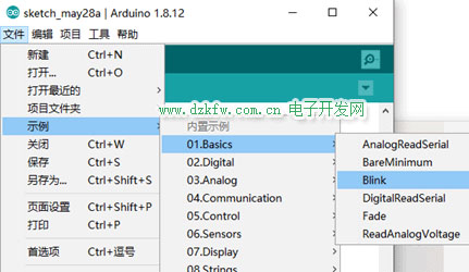 Arduino IDE自带了很多示例程序,是很好的入门材料。例如01.Basics里的Blink,使用板载的13引脚LED,交替亮灭。
